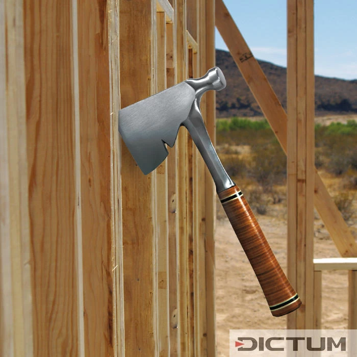 Hachette indestructible, pour l’utilisation en charpenterie. Lame mince à tête de marteau et arrache-clou. Protège-lame en nylon compris.