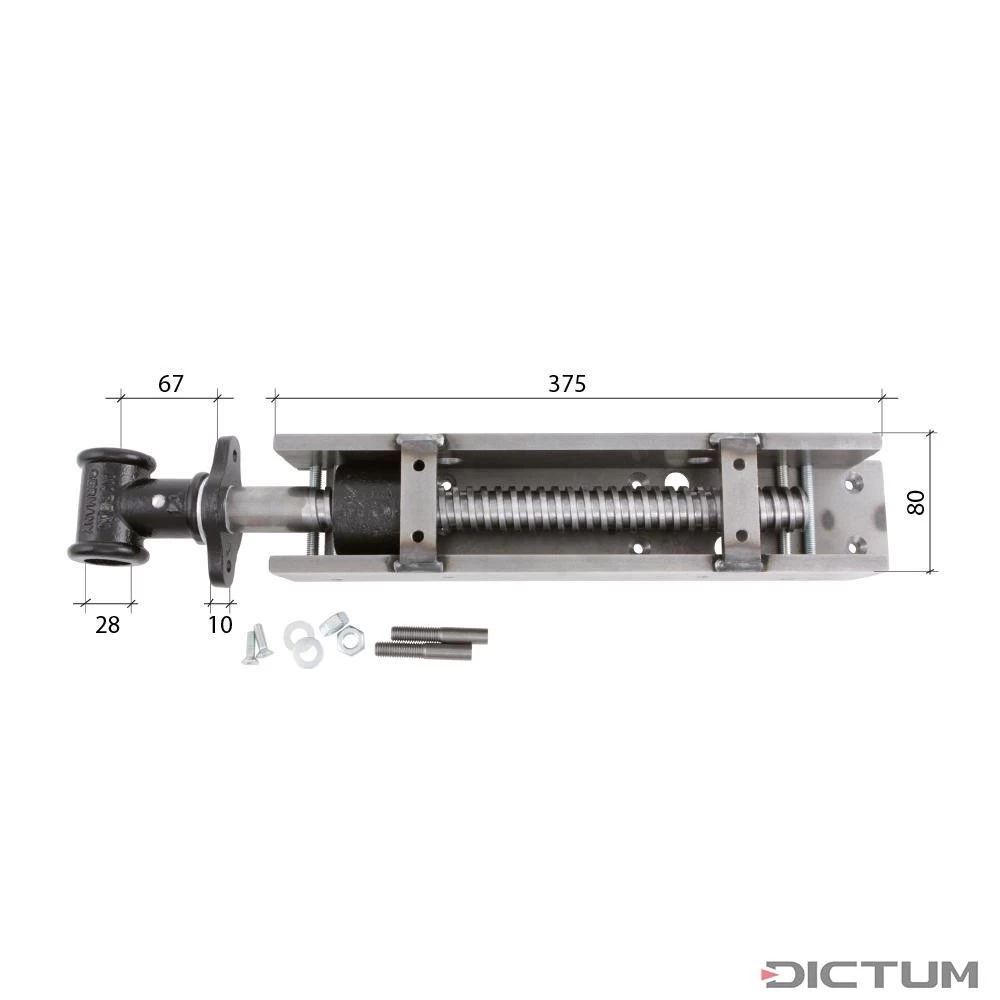 Presse postérieure robuste et résistant à l’usure, proposée par presque tous les grands fabricants de banc de menuisier. Le guide en acier plein, sans jeu et pré-réglé, est facile à monter. Ouverture maximale 210 mm, broche extra-large Ø28 mm, ouverture pour pince-clé : 27 mm. Longueur du système : 350 mm. Fabriqué en Allemagne.